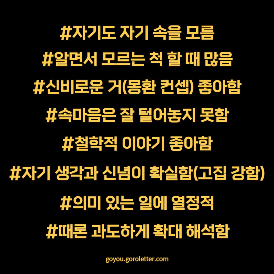 INFJ 머릿속 INFJ는 어떤 생각을 하고 있을까요? 그 생각을 들여다보면 다음과 같습니다.